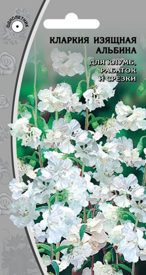Однолетнее растение. Куст густоветвистый, объемный диаметром до 35 см. Стебли тонкие, крепкие, 60 см высотой. Листья овальные, сизо-зеленые с красными жилками. Цветки махровые, белоснежные, до 3-4 см в диаметре, расположены по одному в пазухах листьев. Размножают семенами, которые высевают в апреле в открытый грунт или полутеплый парник. Всходы появляются через 10-14 дней. На постоянное место высаживают в конце мая, закаленные растения легких заморозков не боятся. Посадку в грунт осуществляют обязательно с большим влажным комом земли, выдерживая расстояние между растениям 20-25 см. Для получения компактных, обильно цветущих кустиков верхушки растений прищипывают на высоте 12 см, после чего они хорошо ветвятся и обильно цветут. Используют для групповых посадок, клумб, рабаток и срезки. Особенно хороша кларкия в букетах. В срезке у кларкии распускаются все бутоны.